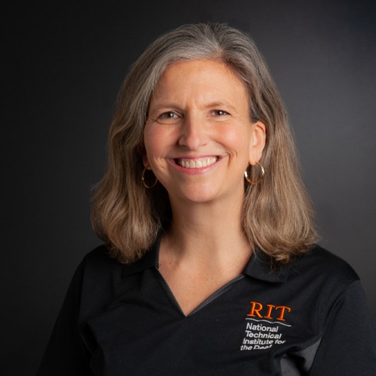 Cindy Officer is a senior lecturer who teaches writing to deaf and hard of hearing students at the National Technical Institute of the Deaf at RIT. She comes from a family with many members who have some form of hearing loss.